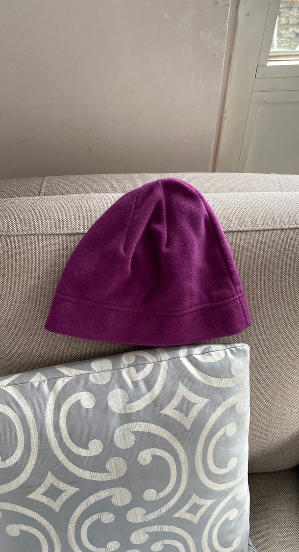 Yumuşak ve rahat mor polar kumaştan kadın bere, ayarlanabilir Velcro detayıyla basic bir tarz sunar.
