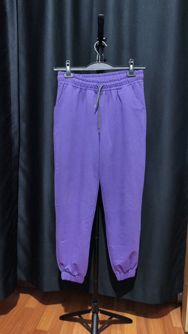 Mor renkli, rahat kesim ve midi boy kadın eşofman altı, yumuşak ve sıcak kumaştan üretilmiştir. Spor ve günlük sokak stili için uygundur.