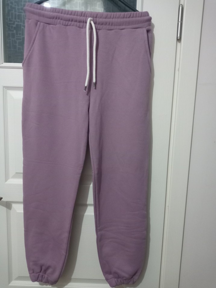 Mor pastel tonlarında, bağcıklı bel ve lastikli paçalarla rahat kesim kadın eşofman altı, yumuşak 3 iplik kumaştan günlük kullanım için. yeni unisex marka temsili