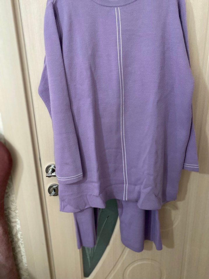 Mor renkte, uzun kollu ve yuvarlak yakalı kadın triko eşofman takımı. Rahat kesimi ve örgü dokusuyla günlük kullanıma uygun, konforlu bir modeldir.