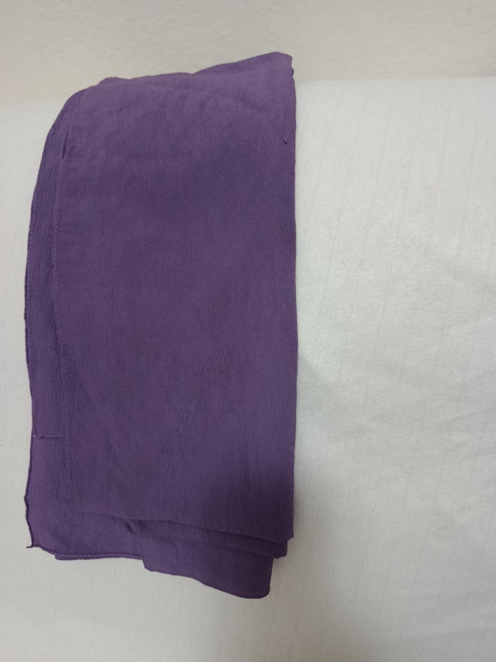 Koyu mor renkli keten kumaştan yapılmış, drapeli tasarıma sahip kadın şalı, minimalist ve normcore tarzını yansıtır.