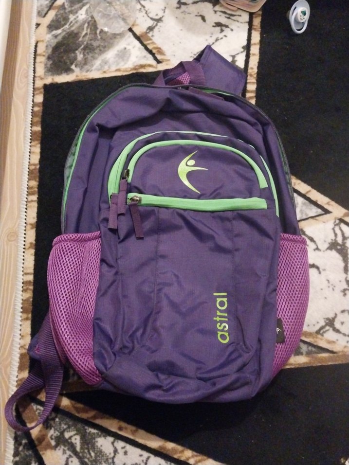 Bu koyu mor kadın sırt çantası, yeşil fermuarlı çoklu bölmeler ve yanlarda file cepler içerir. Üzerinde 'astral' markası bulunmaktadır.