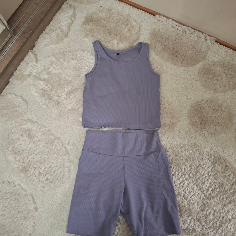 Mor renkli, kolsuz ve fitted crop top ile yüksek bel şorttan oluşan yumuşak ve sıcak kumaş spor takımı. Spor için uygun. ♀️