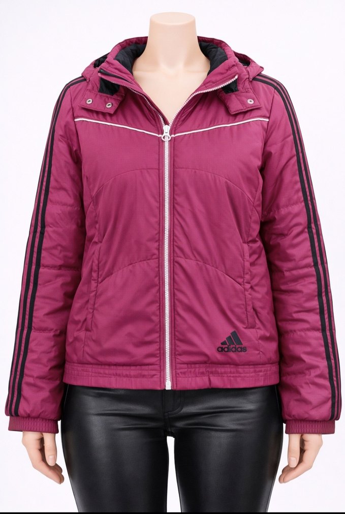 Mor renkli, fermuarlı ve uzun kollu, sentetik kumaştan yapılmış, straplez yakalı, dar kesim kadın kışlık cekettir. Gençler için spor ve streetwear tarzına uygundur.