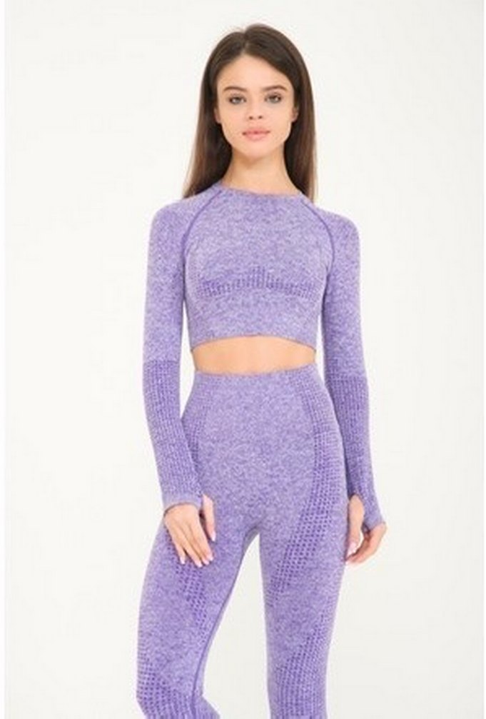 Mor ve gri tonlarında, uzun kollu, yuvarlak yakalı, kısa kesim, örgü dokulu kadın spor takımı. Athleisure tarzına uygun, vücuda oturan tasarım. ♀️ iç etiketi yok birkere giyildi marka temsili