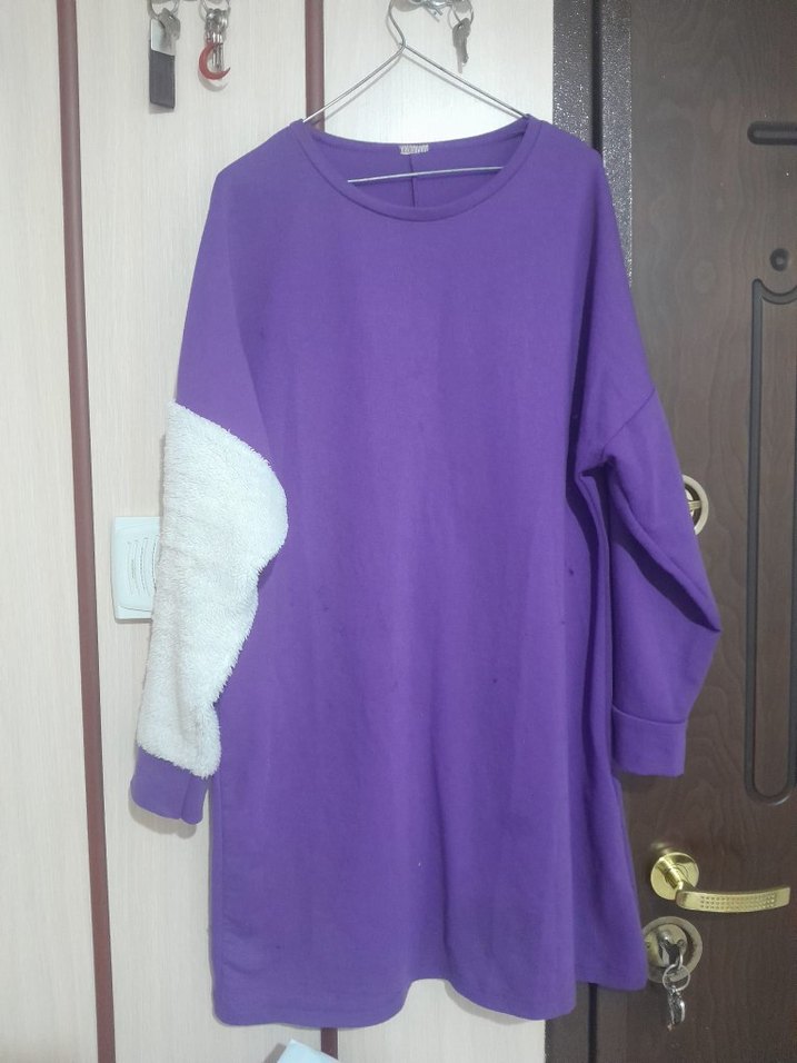 Mor renkli, uzun kollu ve yuvarlak yakalı, tek kollu kürk detaylı bol kesim sweatshirt. Yumuşak ve sıcak kumaştan üretilmiştir, günlük kullanıma uygun.
