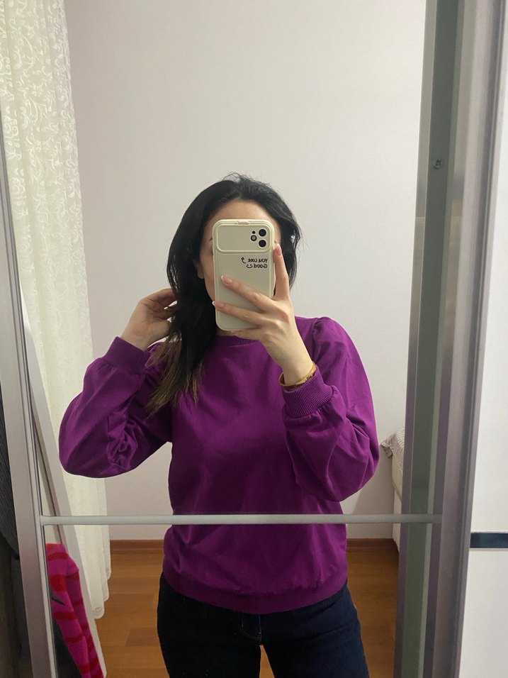 Mor renkte, uzun kollu ve yuvarlak yakalı kadın sweatshirtü. Yumuşak ve sıcak kumaştan, rahat kesim ve gündelik kullanım için uygun.