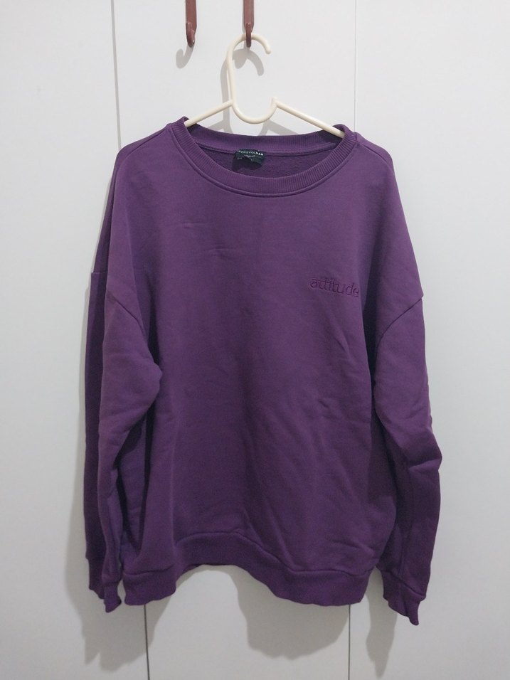 Koyu mor renkli, uzun kollu, yuvarlak yakalı kadın sweatshirtü. Salaş kesimi ve yumuşak kumaşı rahat ve günlük kullanım için uygundur. Minimal nakış detayına sahiptir.