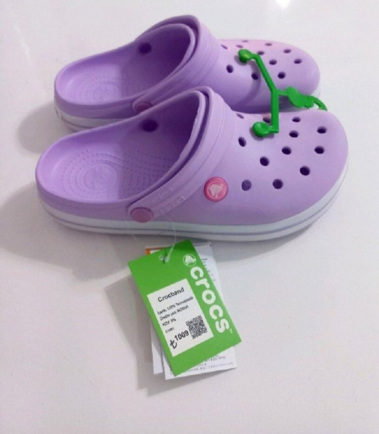 Mor Crocs kadın terlikleri, pastel tonlu ve baskılı. Kauçuk malzeme ve cırt cırtlı detaylı, topuklu rahat tasarım.