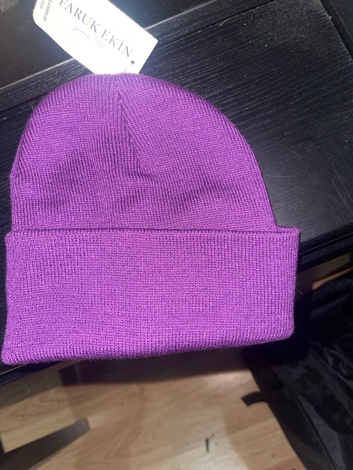 Mor renkli kadın bere, triko örme ve yumuşak, 'FARUKEKIN' etiketi bulunmaktadır.