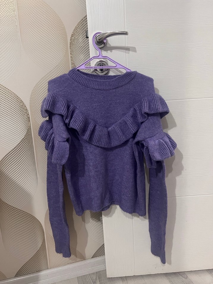 Mor renkli, triko kumaştan yapılmış, yuvarlak yaka ve uzun kollu, fırfırlı detaylara sahip, günlük kullanıma uygun rahat ve dar kesim kazak.