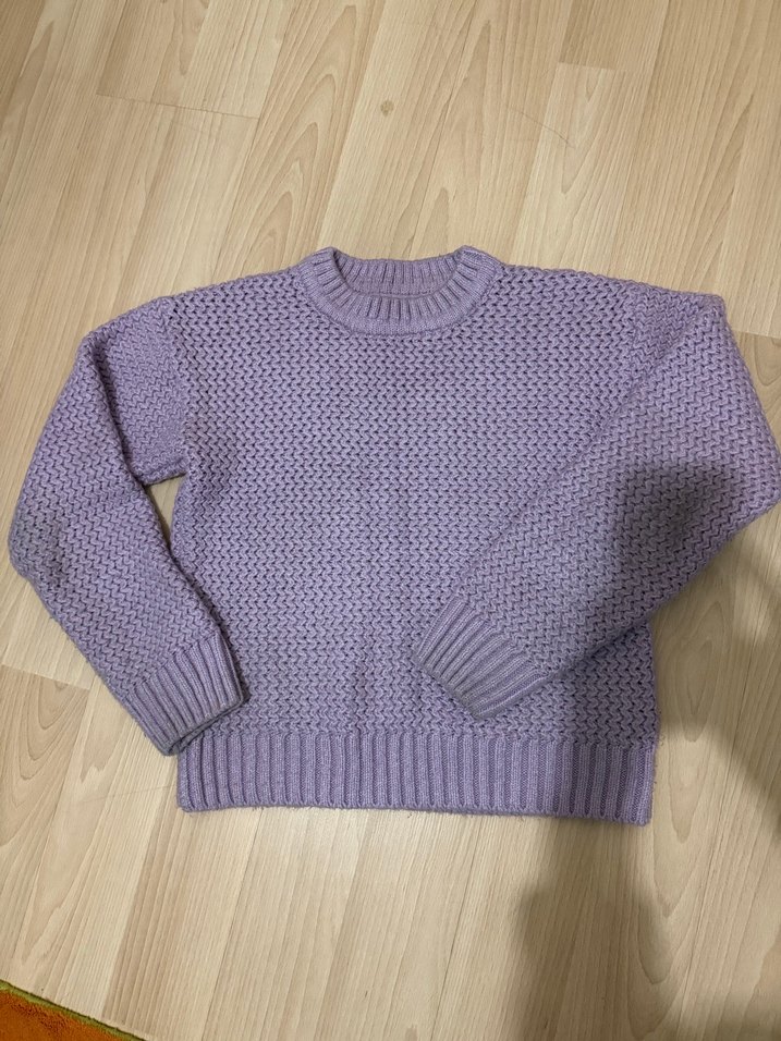 Mor renkli, uzun kollu, yuvarlak yakalı, rahat kesim örme kadın kazak. Günlük kullanım için sade ve desensiz tasarıma sahip.