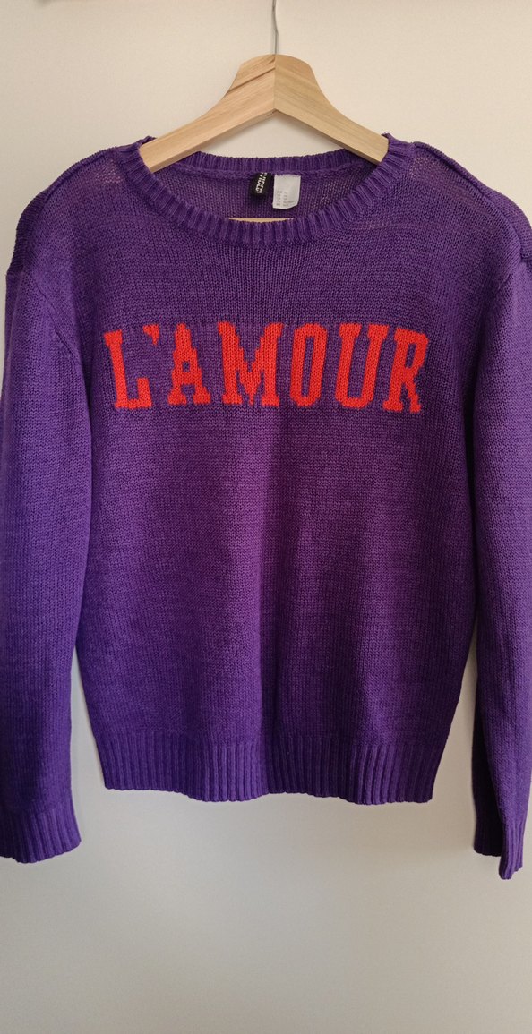 Mor renkli, örgü dokuma, uzun kollu ve yuvarlak yakalı bu kadın kazağı, bol kesim ve "L'AMOUR" yazısıyla rahat ve şık bir görünüm sunar. Günlük kullanım için uygundur.