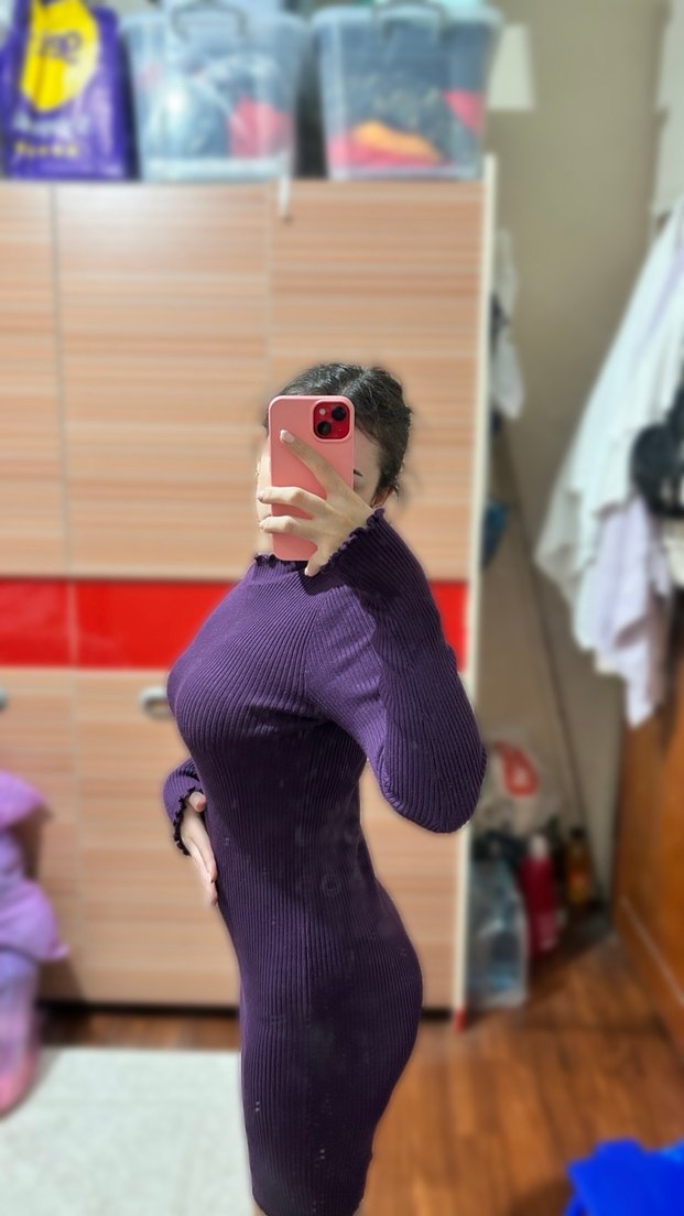 Mor renkte, yüksek yakalı ve uzun kollu, vücuda oturan midi uzunlukta triko kısa elbise,kışın 2 kere falan giydim