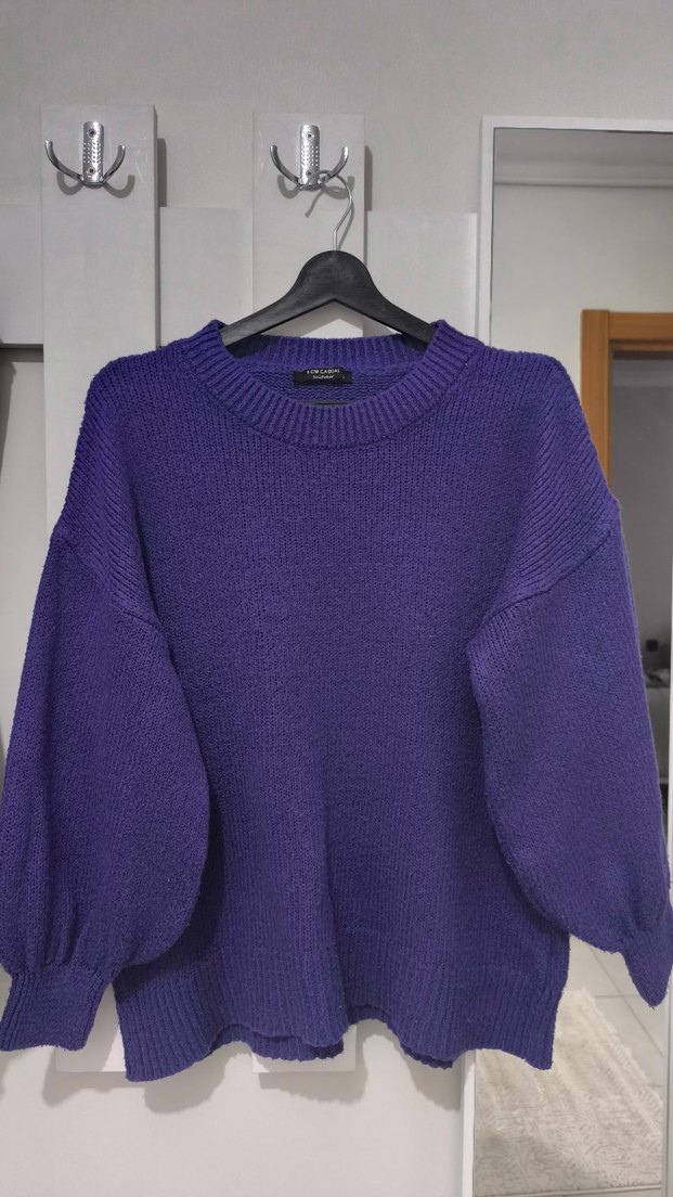 Mor renkli, yuvarlak yaka ve uzun kollu, bol kesim triko kazak. Sade ve desensiz tasarımıyla rahat ve günlük kullanıma uygun.
