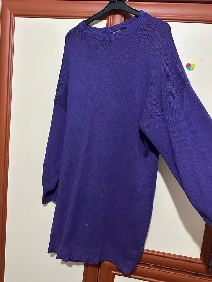 Mor renkte, uzun kollu, yuvarlak yakalı, rahat kesim kadın triko sweatshirt. Yumuşak ve sıcak kumaştan örülmüştür, günlük kullanıma uygundur.
