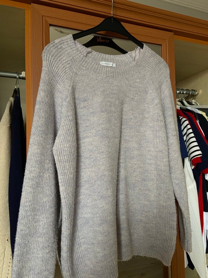 mor renkte, yuvarlak yakalı ve uzun kollu, rahat kesimli triko kazak. Yumuşak dokusuyla günlük kullanıma uygundur.