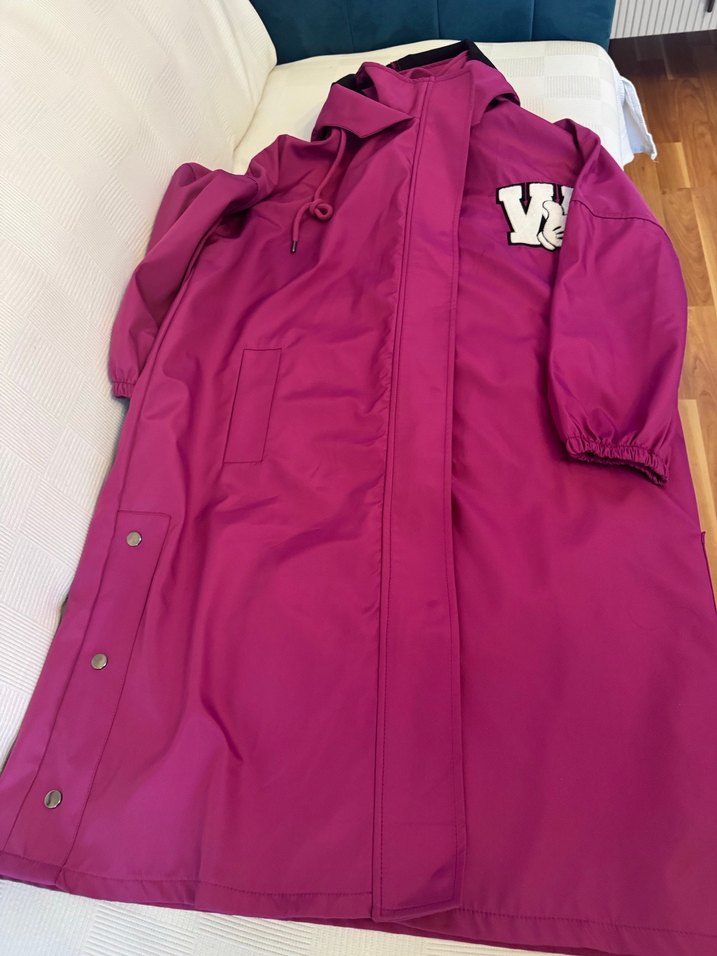 Mor renkli, uzun boy, bol kesim yağmurluk. Yaka kısmı kesimli ve düğmeli, uzun kollu, içi yumuşak kumaşla kaplıdır. Günlük kullanım için uygundur. ️