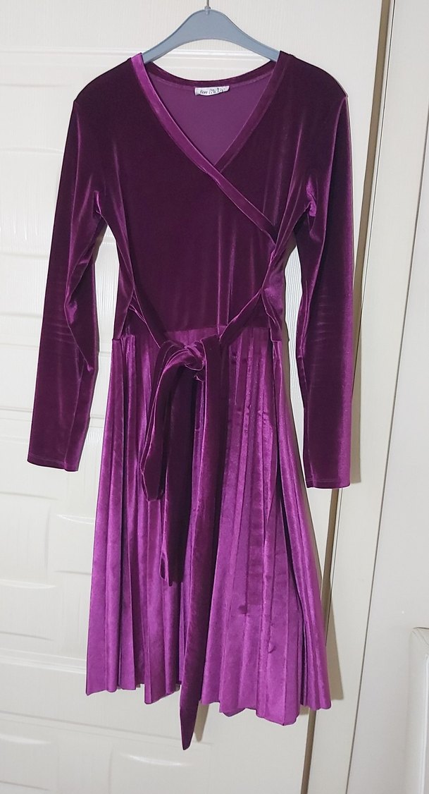 Kadınlar için uzun, mor kadife kumaştan yapılmış, fit kesim ve uzun kollu, kuşaklı elbise. Düz ve koyu gotik tarzda.