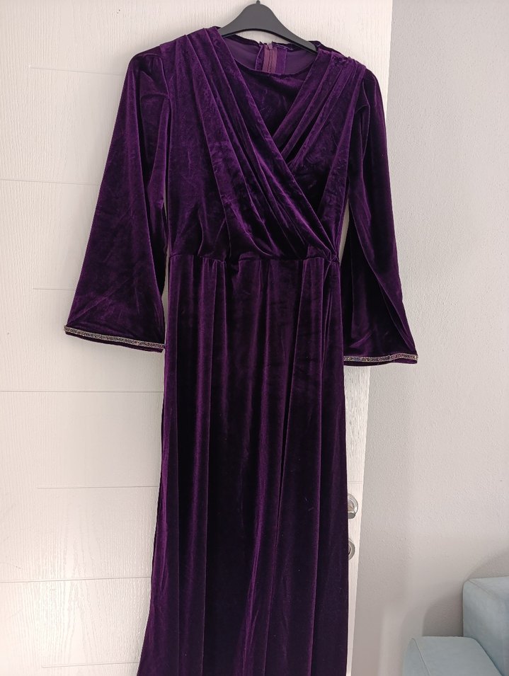 Koyu mor, drapeli bisiklet yaka ve uzun kollu uzun elbise. kadife elbise koni etek tarzında tesettüre uygun özel dikim kemerli bir elbisedir 40-42 bedene uygundur