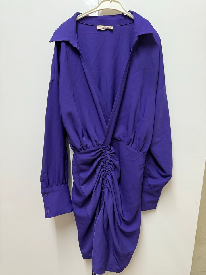 Mor Kadın Uzun Kollu Büzgülü Elbise