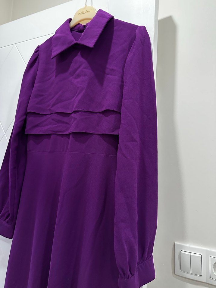 Mor renkte, uzun kollu ve yakalı, salaş kesim kadın elbisesi. İpeksi kumaş ve drapeli tasarımıyla ofis ve sokak modasına uygundur.