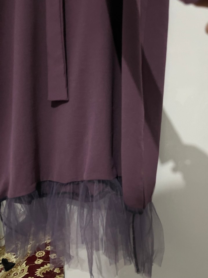 Bu mor uzun elbise, uzun kollu, yuvarlak yakalı ve bol kesim olup, etek kısmında fırfır detaylarıyla sentetik kumaştan yapılmıştır.