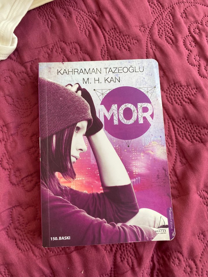 Kahraman Tazeoğlu ve M.H. Kan'ın 'Mor' adlı romanı, 150. baskı olup, kapakta düşünceli bir genç kadını mor tonlarda gösterir.