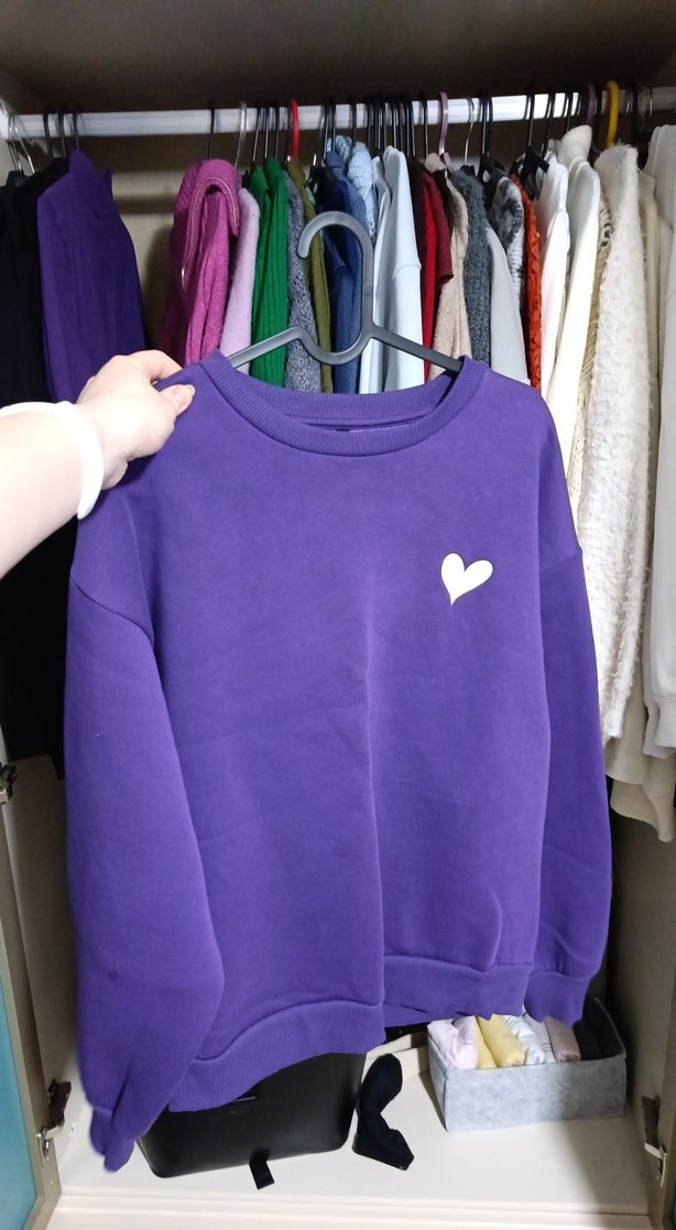 Mor renkte, yuvarlak yakalı ve uzun kollu, yumuşak ve sıcak kumaştan üretilmiş bol kesim kadın sweatshirt. Üzerinde beyaz kalp baskısı bulunur.