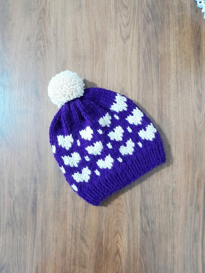 Mor renkli örgü bere, beyaz kalp desenleri ve üstte beyaz ponpon ile bohem tarz için sıcak ve renkli bir aksesuardır.