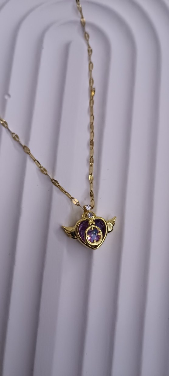 Mor kalp şeklinde kanat detaylı, taş süslemeli zincir detaylı kolye, cesur minimalist goth tarzı için uygundur.