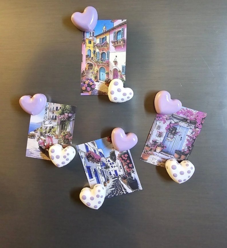 Fotoğraf ve notları tutmak için pastel mor kalp şeklinde, puantiyeli mıknatıs seti.