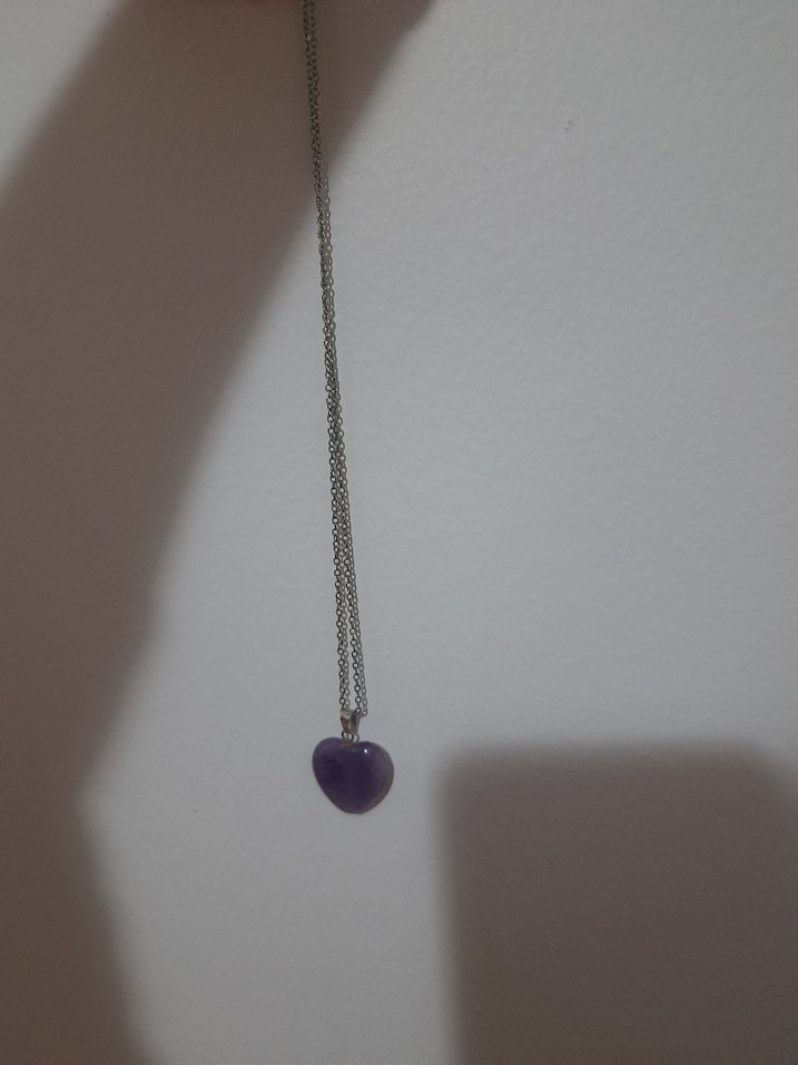 Hediye gelmiştir. Doğal taşa benzemektedir, ametist olduğu düşünülmektedir. Kullanılmamıştır. Kalp formu, zinciriyle birlikte gönderilecektir.