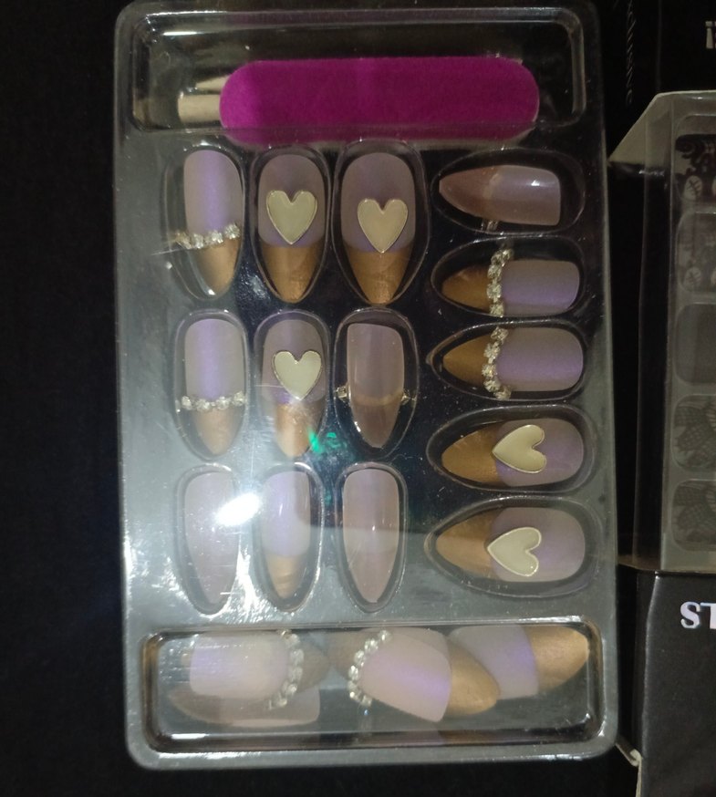 Mor kalp ve taş detaylı tırnak süslemeleri, şık bir görünüm sunar. Uygulama için tırnak törpüsü dahildir.