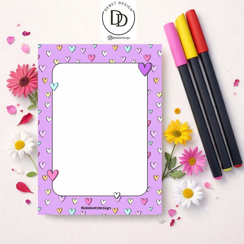 Mor renkte, kalp desenli çerçeveye sahip pastel planlayıcı. Notlar için boş alan içerir A5 boyutunda 30 yaprak 80 gr kağıt tek taraflı baskı sert arka kapak destekli