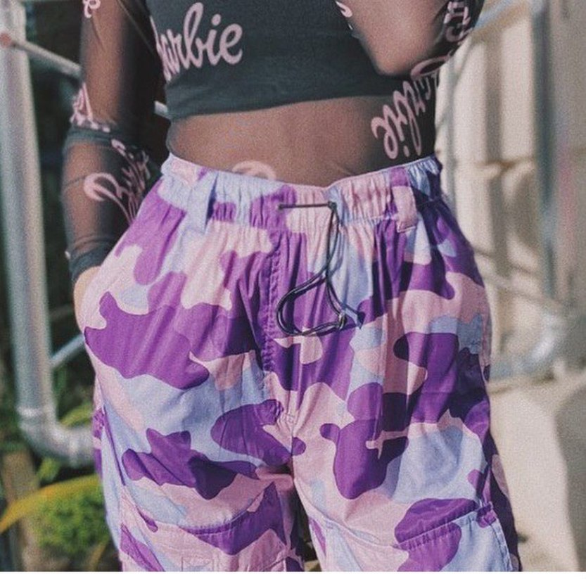 Mor pastel tonlarda kamuflaj desenli, kemerli ve bol kesim pantolon. trend sokak stili için uygundur. 40,42 uyumlu