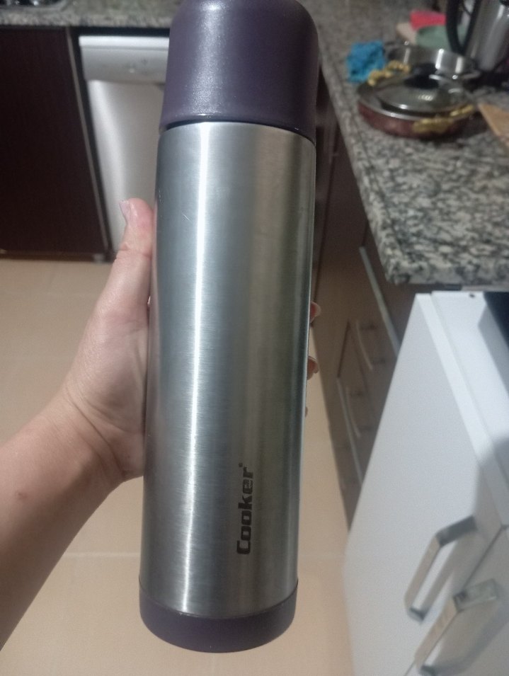 Mor kapaklı gri çelik termos, içecekleri uzun süre sıcak veya soğuk tutar. Taşınabilir ve çocuklar için uygundur.