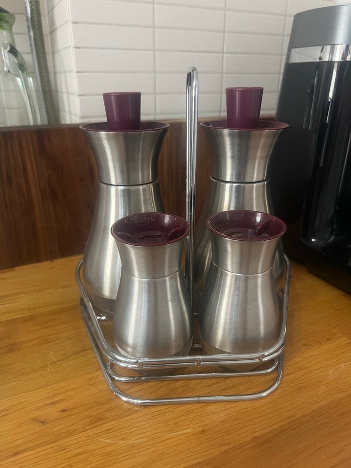 Paslanmaz çelikten yapılmış, mor kapaklı ve gri metal tutuculu dört parçalı baharat seti.