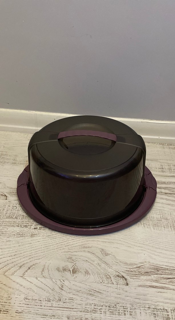 Üstünde taşıma sapı bulunan mor plastik kek saklama kabı. Kapağı ve tabanı uyumlu mor renktedir.