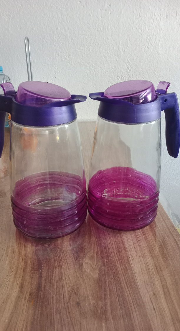 Mor kapaklı ve saplı, içecek saklamak ve servis yapmak için uygun renkli cam sürahiler.