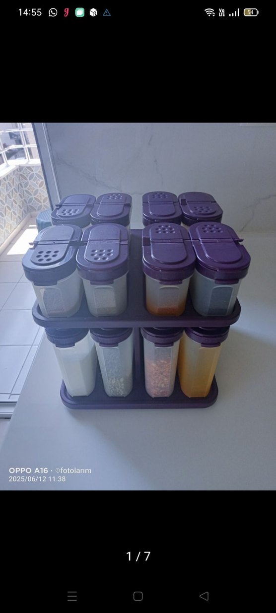 Mor kapaklı plastik baharatlıklar, uyumlu raf üzerinde düzenli şekilde yer alıyor. Çeşitli baharatların saklanması için uygundur. kullanılmıştır kullanıma engel sorunu yoktur