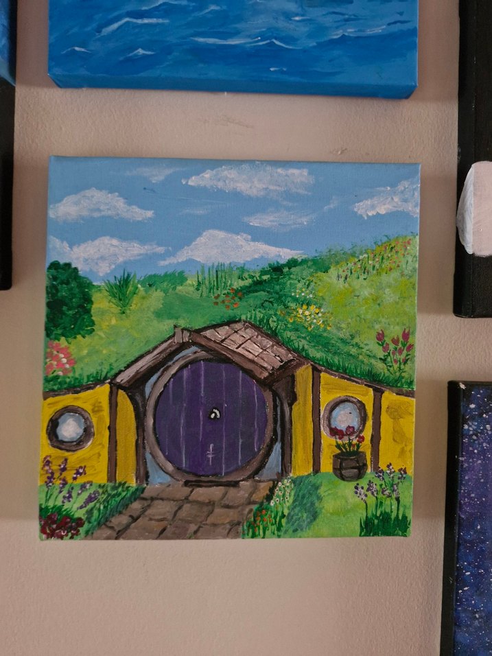 Mor yuvarlak kapılı, sarı duvarlı bahçe manzarası, yeşillikler ve çiçeklerle çevrili, bulutlu mavi gökyüzü altında bir tablo.