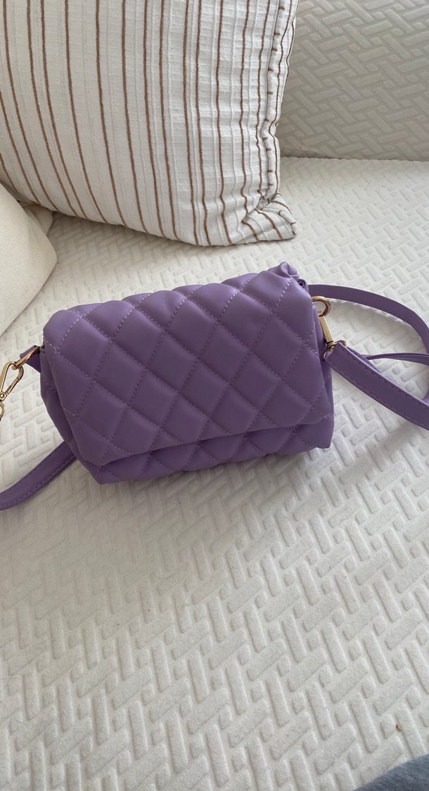 Pastel mor renkte, kapitone desenli, kemerli ve sentetik kumaştan yapılmış kadın çantası. Modern klasik tarzıyla günlük kullanıma uygundur.