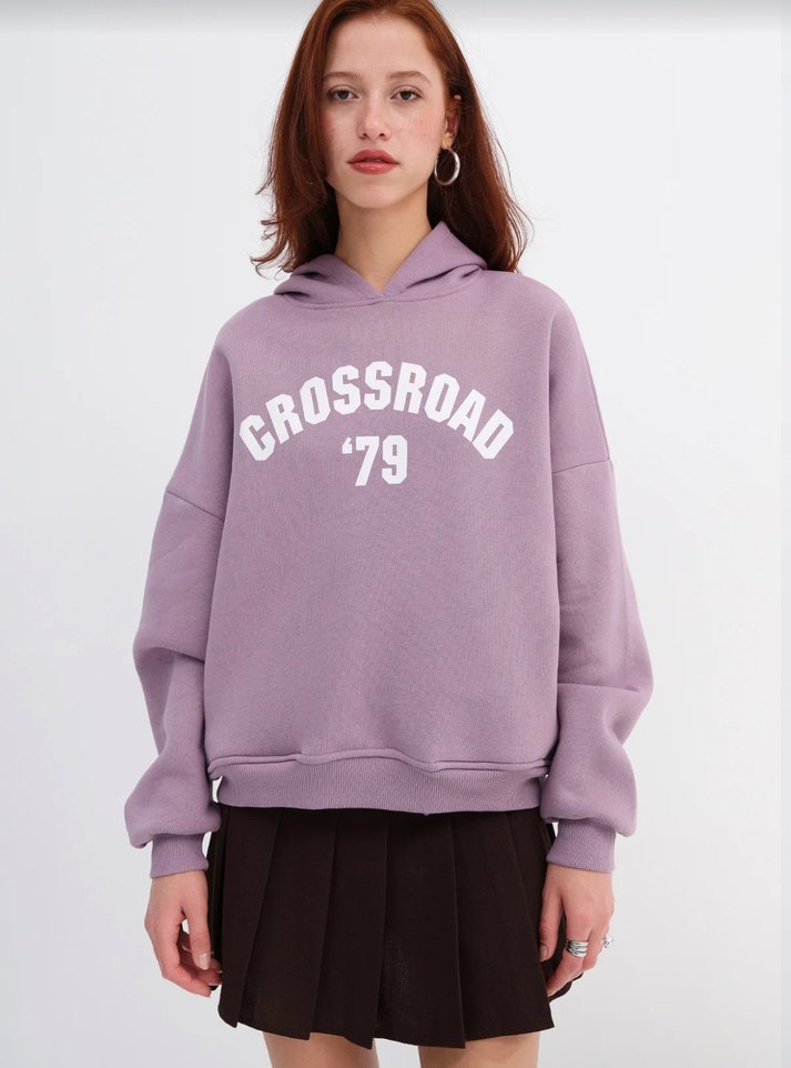 Mor renk, kapüşonlu ve uzun kollu, baskılı 'CROSSROAD '79' yazılı salaş sweatshirt. Yumuşak ve rahat kumaştan, günlük kullanıma uygun.