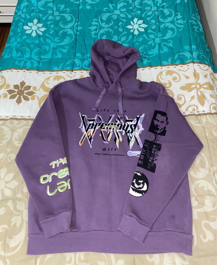 Mor kapüşonlu unisex sweatshirt, uzun kollu ve bol kesimdir. Baskılı, rock punk tarzı ve sentetik kumaştan yapılmıştır. Günlük kullanım için uygundur.