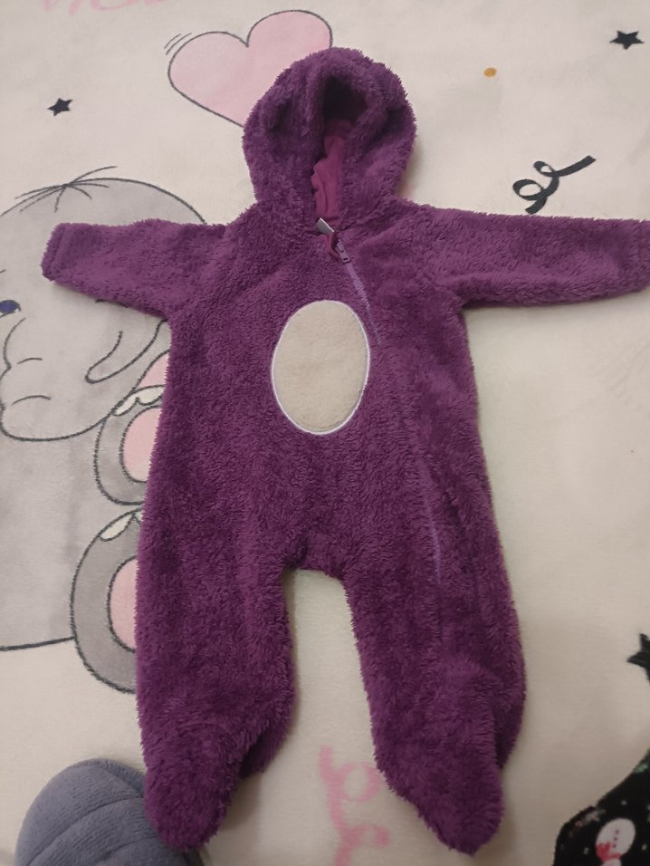Mor kapüşonlu, yumuşak ve kürklü detaylı bebek kış tulumu. Desensiz ve renkli görünümlü, sıcak tutar. ❄️ 3-6 ay