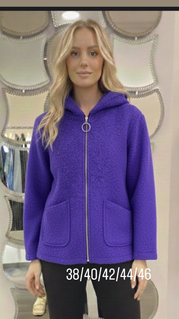 Mor kapüşonlu, fermuarlı, yumuşak ve sıcak kumaştan üretilmiş, bol kesim kadın ceket. Uzun kollu ve iki ceplidir, 38-46 beden aralığında mevcuttur. Siyah ve kahverengi renkler de mevcut