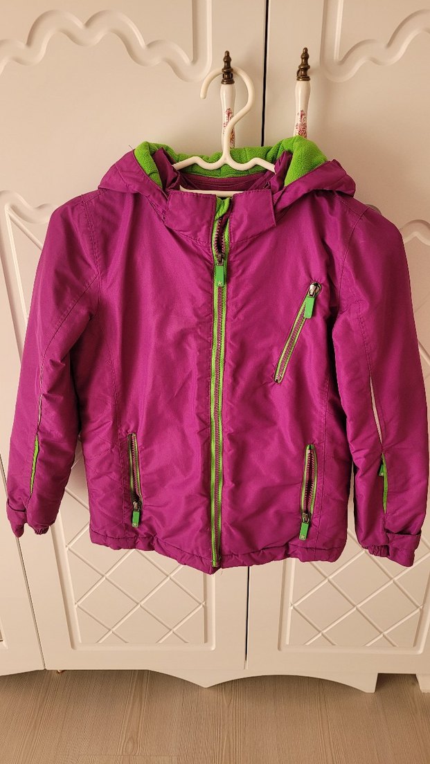 Mor renkli, kapüşonlu ve fermuarlı kız montu, yumuşak ve sıcak kumaştan, yeşil astarlı ve sokak tarzına uygun.