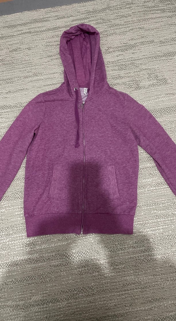 Mor renkli, kapüşonlu ve fermuarlı kız ceketi.