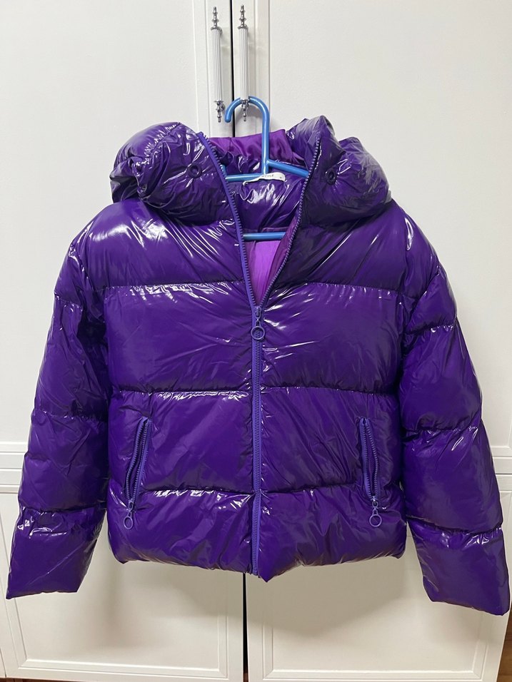 Mor kapüşonlu, fermuarlı cepli kadın kışlık mont. Sentetik kumaştan, midi boy ve askılı kollu, outdoor ve sokak tarzına uygun.